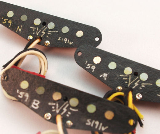 Available in 1959-spec all SOUTH-up orientation, or with Reverse-Wound/Reverse Polarity middle pickup for hum cancellation in combination positions 2 and four on modern 5-way Stratocaster pickup switches. (Please note that original 1959 pickups were all wound in the same direction and same polarity, but those guitars only had 3-way Switches! If you want hum cancellation in positions 2 and four, don't choose all-south polarity.)
